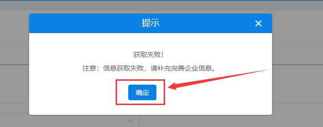 如果系统提示获取失败,请点击【确定】后,自行补充企业基本信息,带*为必填项,如下图: