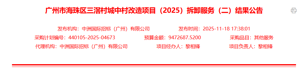 广州市海珠区三滘村城中村改造项目(2025)拆卸服务(二)结果公告
